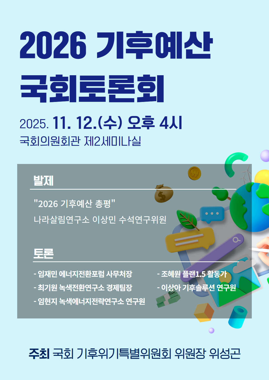 2026년도 예산안 중 기후위기 대응 및 탄소중립 관련 예산 현황과 문제점을 분석하고 기후예산 개선 방향을 모색하기 위한 국회토론회가 열립니다. 이번 토론회에서는 부문별 기후예산 현성의 실효성을 검토하고, 온실가스 감축 목표 달성 및 기후위기 대응 실행력 강화를 위한 예산 개선 방안을 논의하고자 합니다.