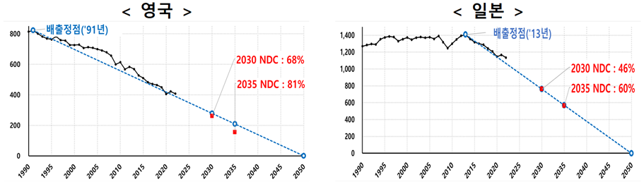 2035 NDC 수립을 위한 논의 과정에서 정부는 주요국의 2035 NDC 가 ‘선형감축경로’에 따라 설정되었다는 취지로 설명하고 있다. ‘선형감축경로’란 배출정점 연도의 배출량과 탄소중립 연도의 배출량(0)을 직선으로 연결한 경로 위에서 감축목표를 정하는 방식이다. 그러나 선형감축경로는 국가별 감축목표의 의욕 수준을 객관적으로 비교하는 기준이 될 수 없다. 국가마다 배출정점 연도는 매우 다르기 때문이다. 가령, 독일과 EU의 배출정점 연도는 1990년, 영국은 1991년, 미국은 2004년, 일본은 2013년이다. 우리나라의 배출 정점 연도는 이보다 훨씬 늦은 2018년이다.