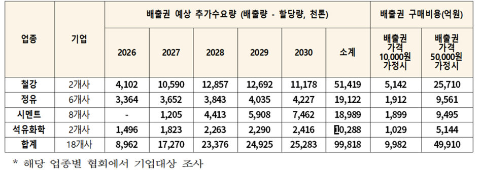 산업계가 배출권거래제 제4차 계획기간 동안 업계가 추가로 부담하게 될 배출권 구매비용이 5조원에 달할 것이라고 주장하고 있다. 대한상공회의소 등 산업계는 지난 5일, 철강·화학·시멘트·석유화학 등 4개 업종 18개사를 대상으로 추가 배출권 수요를 조사한 결과 내년부터 2030년까지 예상되는 배출권 초과 수요가 약 1억톤에 달하며, 톤당 5만 원의 배출권 가격을 가정할 때 약 5조원의 부담이 발생한다고 주장했다. 산업계는 “다수 사업장이 배출권 구매비용 급증에 직면할 것"이라고 난색을 표하고 있다.